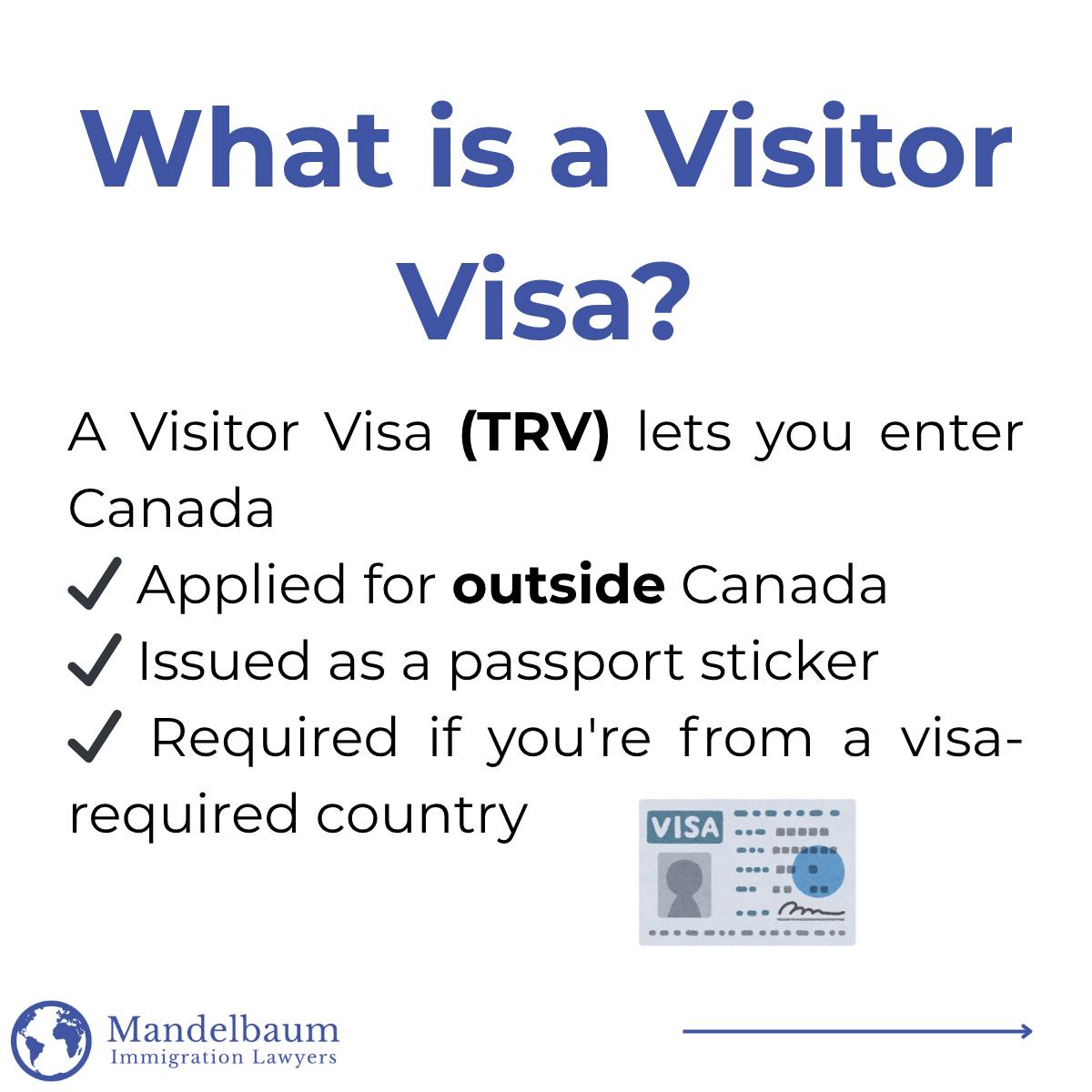 Your Visitor Visa technically a Temporary Resident Visa lets you enter Canada. You apply from outside Canada, and once approved, the visa shows up as a sticker in your passport.